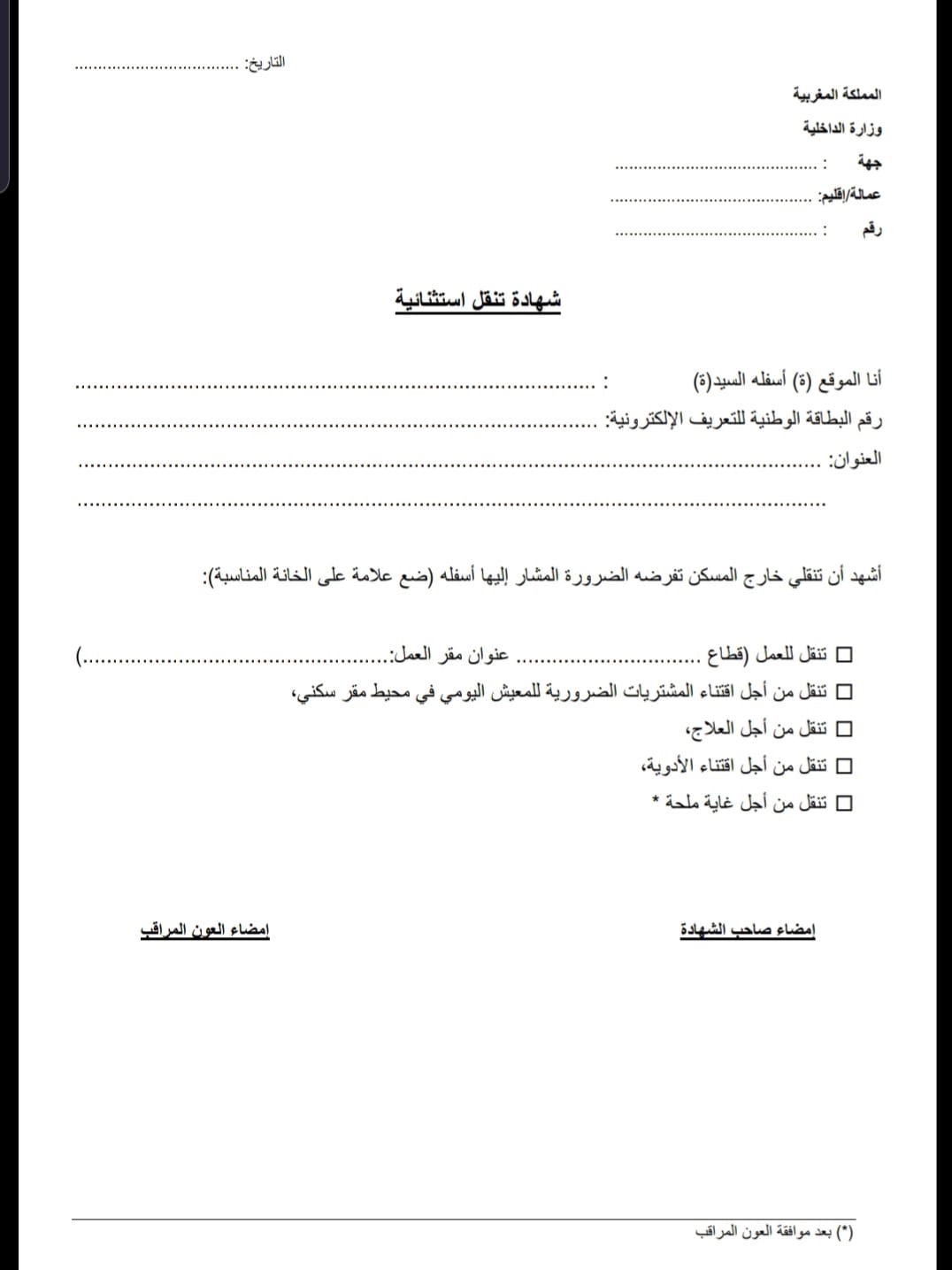 ومن الواجب على المواطن، في حالة مغادرة بيته، حمل هذه الوثيقة معبأة ومختومة من مصالح السلطات العمومية المختصة، والتي سنباشر توزيعها على المواطنين ببيوتهم، فضلا عن حمله لبطاقة التعريف الوطنية وذلك للإدلاء بالوثيقتين في نقط المراقبة.